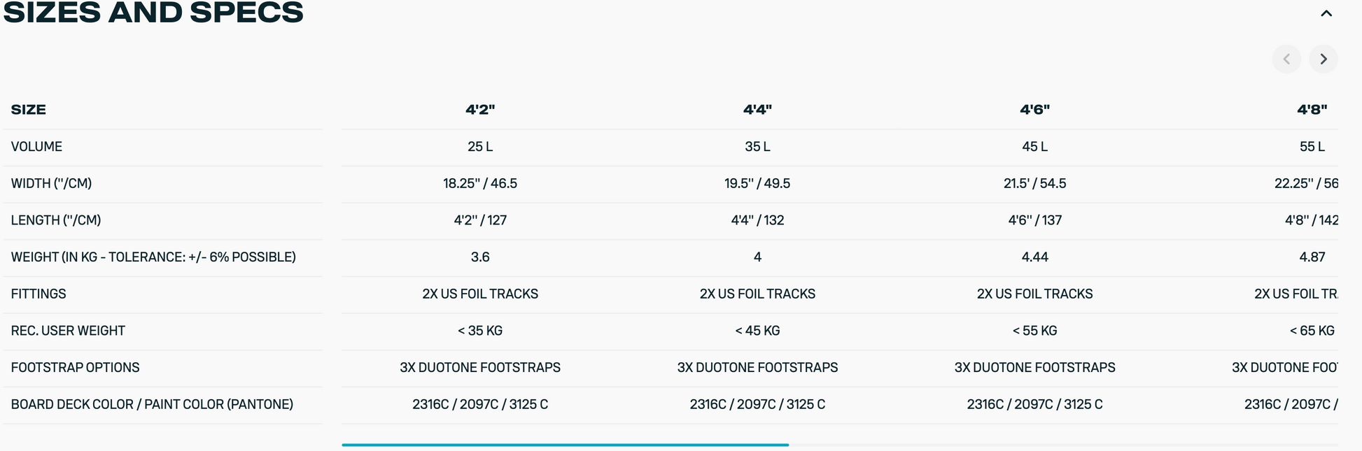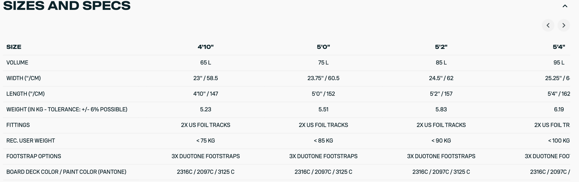 Size | Windrange | Weight (kg w/o boom) | Wingspan (cm) | Max inflation pressure* | Control Unit | Rec. Leash size